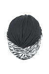 Lekki turban z szarfą. Upięcie nad czołem nadaje klasycznego kształtu, a fantazyjny wzór szarfy ożywi stylizację.