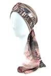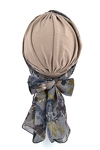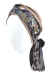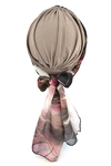 Bardzo ładny i elegancki zestaw, który składa się z turbanu oraz dwóch szarf. Motywy na szarfach zostały dopasowane kolorystycznie do gładkiej czapeczki. Dzięki temu można uzupełniać swoje codzienne stylizacje o ciekawe detale.