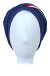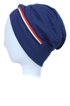 Turban o klasycznym kroju stworzony z myślą o codziennym użytkowaniu. Wykonany z lekkiego i oddychającego materiału, który zapewnia komfort skóry głowy nawet podczas gorących dni. Dekoracyjnym elementem jest przednie pasmo zdobione trzykolorową aplikacją.