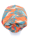 Turban ma wielokolorowy wzór, który łączy jasne odcienie z bardziej jaskrawymi. Wzór jest abstrakcyjny, przypominający pociągnięcia pędzla lub styl ikat.