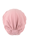 Miękki turban z jednolitego materiału. Zebranie materiału z tyłu głowy nadaje turbanowi ciekawy kształt. Posiada piankowe usztywnienie nad czołem.