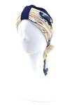 Wyjątkowo ciekawa propozycja turbanu: oprócz bazowej czapeczki w komplecie znajdują się dwie wzorzyste szarfy dopasowane kolorystycznie, aby cały zestaw dawał możliwość swobodnego wyboru stylizacji każdego dnia.