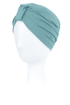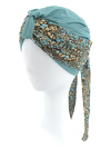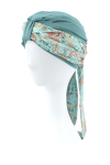 Wyjątkowo ciekawa propozycja turbanu: oprócz bazowej czapeczki w komplecie znajdują się dwie wzorzyste szarfy dopasowane kolorystycznie, aby cały zestaw dawał możliwość swobodnego wyboru stylizacji każdego dnia.