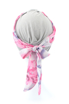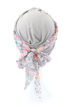 Wyjątkowo ciekawa propozycja turbanu: oprócz bazowej czapeczki w komplecie znajdują się dwie wzorzyste szarfy dopasowane kolorystycznie, aby cały zestaw dawał możliwość swobodnego wyboru stylizacji każdego dnia.