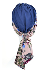 Turban z delikatnym drapowaniem na górze i długimi szarfami do samodzielnego ułożenia. Naturalne materiały zapewniają komfort użytkowania.