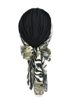 Wyjątkowy turban z ozdobną szarfą w piękne wzory. Kolorowa szarfa z delikatnego materiału w połączeniu z jednobarwną podstawą stanowi elegancki dodatek do każdego stroju. Mocowanie szarfy tylko w górnej części turbanu daje wiele możliwości stylizacyjnych.