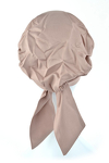 Turban w formie chustki, z krótkimi szarfami do wiązania oraz delikatnym drapowaniem po bokach. Jest bardzo wygodny, a wykonano go z naturalnych, lekkich materiałów.