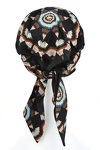 Turban w formie chustki, z krótkimi szarfami do wiązania oraz delikatnym drapowaniem po bokach. Jest bardzo wygodny, a wykonano go z naturalnych, lekkich materiałów.
