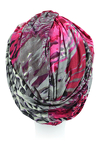 Kolorystyka turbanu jest żywa i urozmaicona dynamicznym wzorem. To intensywne odcienie różu oraz szare uzupełnienie w tylnej części produktu.