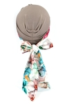 Turban Olivia to ciekawa propozycja do uzupełnienia swojej garderoby. Klasyczna i elegancka czapeczka została uzupełniona o dwie ozdobne szarfy, które są dopasowane kolorystycznie. Dzięki temu można swobodnie dopasować wygląd całości do ubioru na konkretną okazję lub w zależności od nastroju.