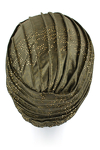 Turban posiada element ozdobny w postaci połączenia pasm materiału z przodu. Stonowany zielony odcień turbanu oraz delikatne złote wykończenie doskonale sprawdzą się przy wielu okazjach.