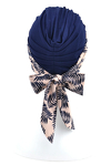 Wyjątkowo ciekawa propozycja turbanu: oprócz bazowej czapeczki w komplecie znajdują się dwie wzorzyste szarfy dopasowane kolorystycznie, aby cały zestaw dawał możliwość swobodnego wyboru stylizacji każdego dnia.